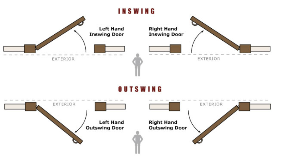 Swing: Used to describe the direction that the door moves. A door can be Left Hand IN-swing, Left Hand OUT-Swing, Right hand IN-swing, or Right Hand OUT-swing. Residential doors are almost always inswing, and commercial doors are almost always outswing. The easiest way to determine the swing of a door is to look at it from the EXTERIOR side of the door and see which side the HINGES are on. The door will naturally swing towards the hinges.